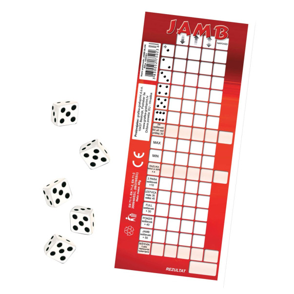 Primerna za 2 ali več igralcev. Komplet vsebuje 5 kock in 50-listni blokec za vpisovanje rezultatov.