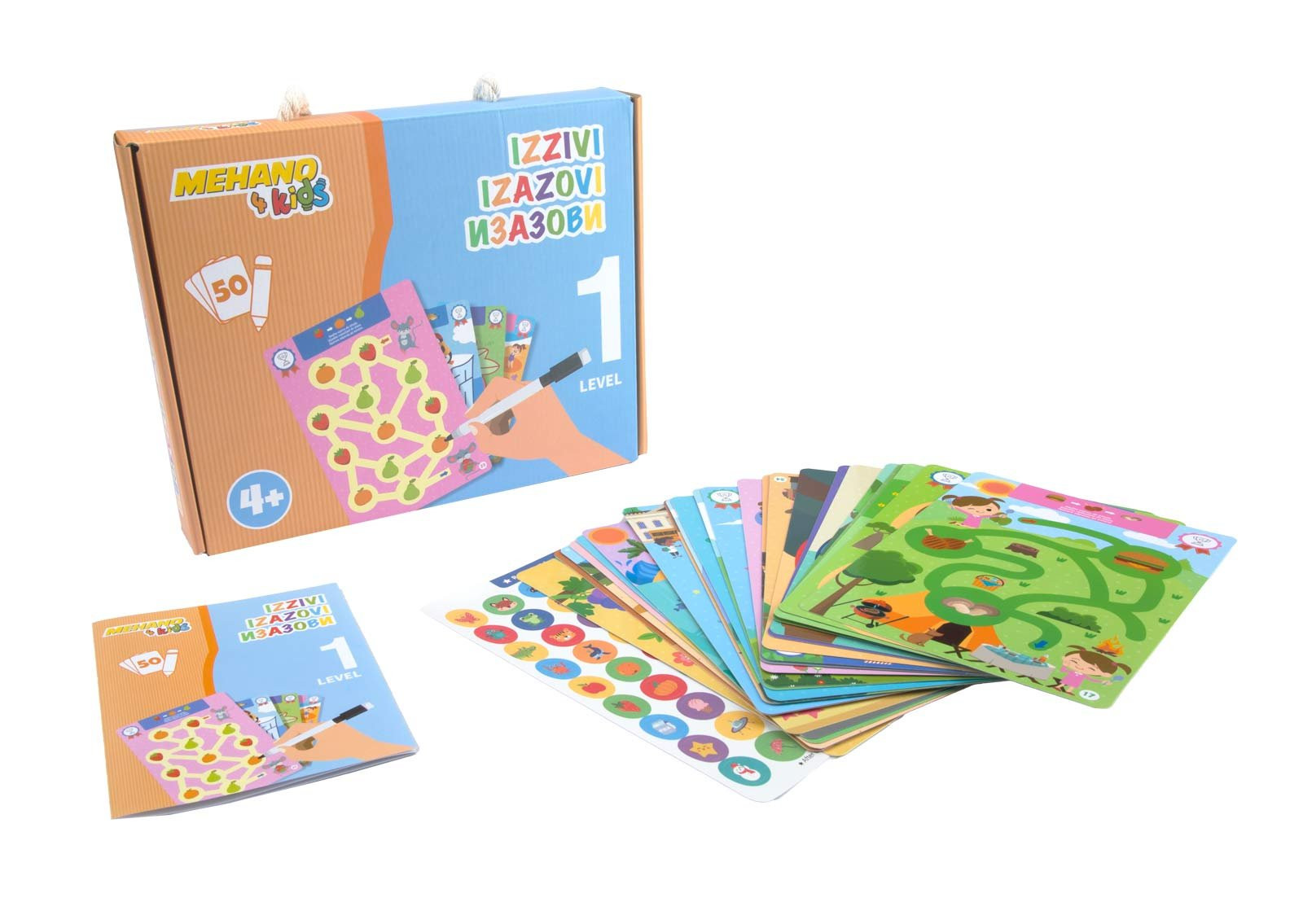 Na vsaki strani kartice je en izziv, kjer mora otrok s piši-briši flomastrom povezati pot od začetka do konca.