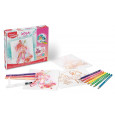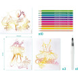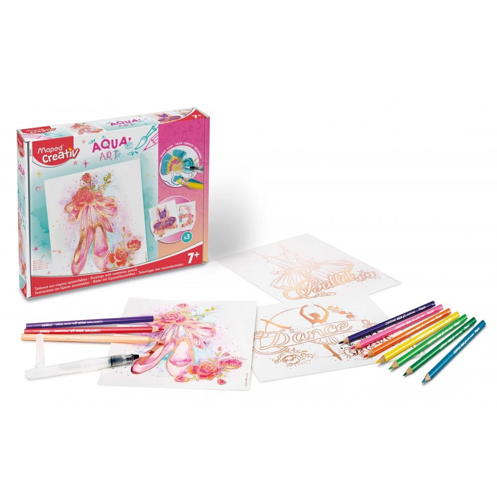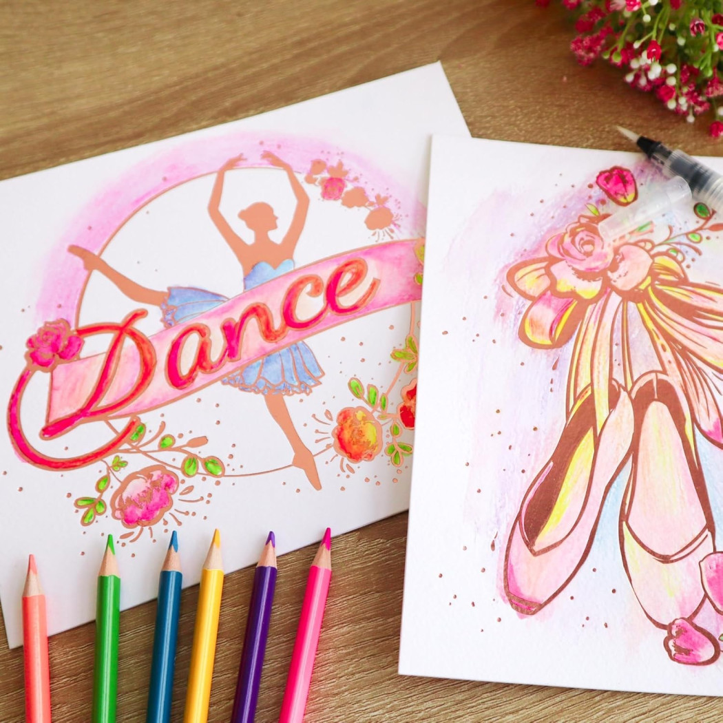 - set vsebuje tri ilustracije z motivi plesnih kreacij, 10 barvic in čopič za vodo