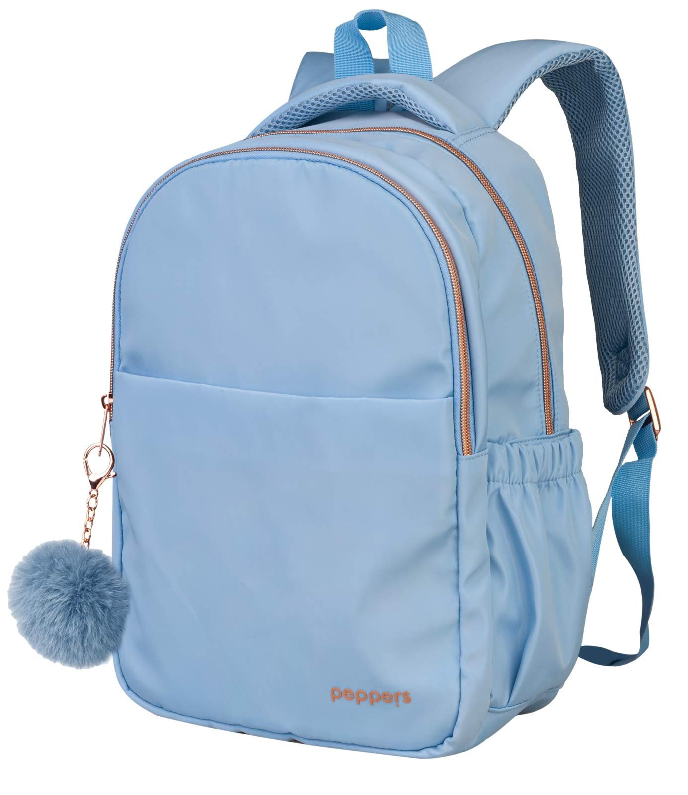 Z modnim dodatkom - pom pom obesek za ključe. Piko na i dajo rose/gold zadrge.