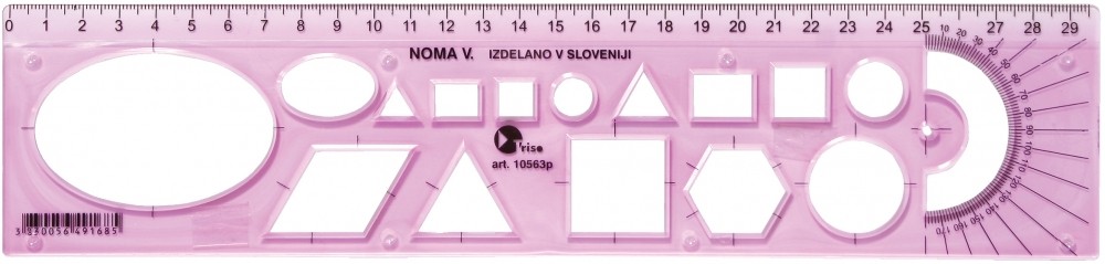 Plastično ravnilo dolžine 30 cm je nepogrešljiv šolski pripomoček. Poleg merilne skale ravnilo vsebuje tudi šablone različnih likov